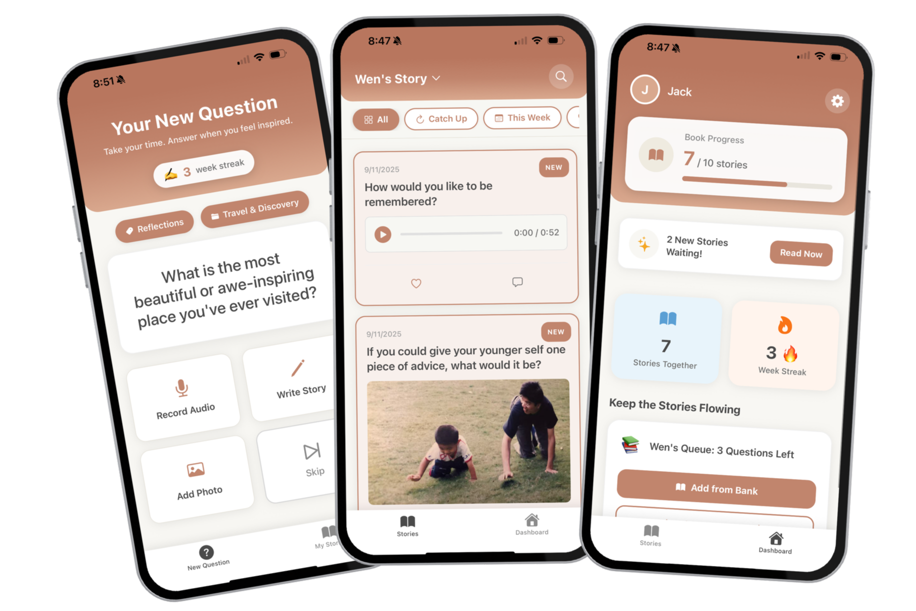 A free to use app built to discover and preserve your families stories. We provide thoughtful, inspiring weekly prompts that make it easy to spark conversations and start curating a personal library of your family's legacy.